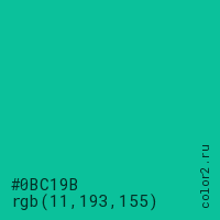 Цвет #0BC19B в цветовой модели RGB обозначается тремя октетами (11, 193, 155) в десятичном формате и #0BC19B в шестнадцатиричном (hex) формате, которые являются интенсивностью красного 11 (hex 0B), интенсивность зелёного 193 (hex C1) и интенсивность синего 155 (hex 9B).