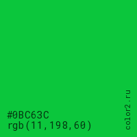 Цвет #0BC63C в цветовой модели RGB обозначается тремя октетами (11, 198, 60) в десятичном формате и #0BC63C в шестнадцатиричном (hex) формате, которые являются интенсивностью красного 11 (hex 0B), интенсивность зелёного 198 (hex C6) и интенсивность синего 60 (hex 3C).