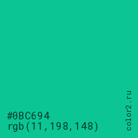 Цвет #0BC694 в цветовой модели RGB обозначается тремя октетами (11, 198, 148) в десятичном формате и #0BC694 в шестнадцатиричном (hex) формате, которые являются интенсивностью красного 11 (hex 0B), интенсивность зелёного 198 (hex C6) и интенсивность синего 148 (hex 94).