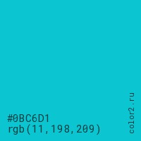 Цвет #0BC6D1 в цветовой модели RGB обозначается тремя октетами (11, 198, 209) в десятичном формате и #0BC6D1 в шестнадцатиричном (hex) формате, которые являются интенсивностью красного 11 (hex 0B), интенсивность зелёного 198 (hex C6) и интенсивность синего 209 (hex D1).