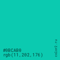 Цвет #0BCAB0 в цветовой модели RGB обозначается тремя октетами (11, 202, 176) в десятичном формате и #0BCAB0 в шестнадцатиричном (hex) формате, которые являются интенсивностью красного 11 (hex 0B), интенсивность зелёного 202 (hex CA) и интенсивность синего 176 (hex B0).