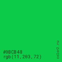 Цвет #0BCB48 в цветовой модели RGB обозначается тремя октетами (11, 203, 72) в десятичном формате и #0BCB48 в шестнадцатиричном (hex) формате, которые являются интенсивностью красного 11 (hex 0B), интенсивность зелёного 203 (hex CB) и интенсивность синего 72 (hex 48).