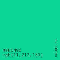 Цвет #0BD496 в цветовой модели RGB обозначается тремя октетами (11, 212, 150) в десятичном формате и #0BD496 в шестнадцатиричном (hex) формате, которые являются интенсивностью красного 11 (hex 0B), интенсивность зелёного 212 (hex D4) и интенсивность синего 150 (hex 96).