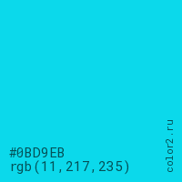 Цвет #0BD9EB в цветовой модели RGB обозначается тремя октетами (11, 217, 235) в десятичном формате и #0BD9EB в шестнадцатиричном (hex) формате, которые являются интенсивностью красного 11 (hex 0B), интенсивность зелёного 217 (hex D9) и интенсивность синего 235 (hex EB).