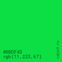 Цвет #0BDF43 в цветовой модели RGB обозначается тремя октетами (11, 223, 67) в десятичном формате и #0BDF43 в шестнадцатиричном (hex) формате, которые являются интенсивностью красного 11 (hex 0B), интенсивность зелёного 223 (hex DF) и интенсивность синего 67 (hex 43).