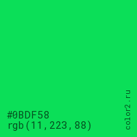 Цвет #0BDF58 в цветовой модели RGB обозначается тремя октетами (11, 223, 88) в десятичном формате и #0BDF58 в шестнадцатиричном (hex) формате, которые являются интенсивностью красного 11 (hex 0B), интенсивность зелёного 223 (hex DF) и интенсивность синего 88 (hex 58).