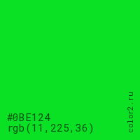 Цвет #0BE124 в цветовой модели RGB обозначается тремя октетами (11, 225, 36) в десятичном формате и #0BE124 в шестнадцатиричном (hex) формате, которые являются интенсивностью красного 11 (hex 0B), интенсивность зелёного 225 (hex E1) и интенсивность синего 36 (hex 24).