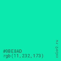 Цвет #0BE8AD в цветовой модели RGB обозначается тремя октетами (11, 232, 173) в десятичном формате и #0BE8AD в шестнадцатиричном (hex) формате, которые являются интенсивностью красного 11 (hex 0B), интенсивность зелёного 232 (hex E8) и интенсивность синего 173 (hex AD).