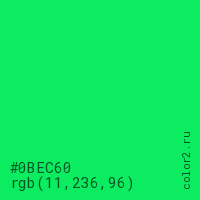 Цвет #0BEC60 в цветовой модели RGB обозначается тремя октетами (11, 236, 96) в десятичном формате и #0BEC60 в шестнадцатиричном (hex) формате, которые являются интенсивностью красного 11 (hex 0B), интенсивность зелёного 236 (hex EC) и интенсивность синего 96 (hex 60).