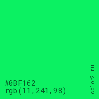 Цвет #0BF162 в цветовой модели RGB обозначается тремя октетами (11, 241, 98) в десятичном формате и #0BF162 в шестнадцатиричном (hex) формате, которые являются интенсивностью красного 11 (hex 0B), интенсивность зелёного 241 (hex F1) и интенсивность синего 98 (hex 62).