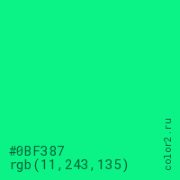 Цвет #0BF387 в цветовой модели RGB обозначается тремя октетами (11, 243, 135) в десятичном формате и #0BF387 в шестнадцатиричном (hex) формате, которые являются интенсивностью красного 11 (hex 0B), интенсивность зелёного 243 (hex F3) и интенсивность синего 135 (hex 87).