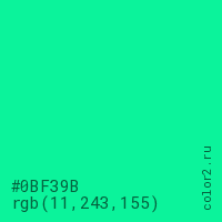 Цвет #0BF39B в цветовой модели RGB обозначается тремя октетами (11, 243, 155) в десятичном формате и #0BF39B в шестнадцатиричном (hex) формате, которые являются интенсивностью красного 11 (hex 0B), интенсивность зелёного 243 (hex F3) и интенсивность синего 155 (hex 9B).