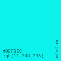 Цвет #0BF3EC в цветовой модели RGB обозначается тремя октетами (11, 243, 236) в десятичном формате и #0BF3EC в шестнадцатиричном (hex) формате, которые являются интенсивностью красного 11 (hex 0B), интенсивность зелёного 243 (hex F3) и интенсивность синего 236 (hex EC).