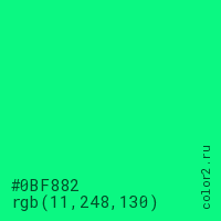 Цвет #0BF882 в цветовой модели RGB обозначается тремя октетами (11, 248, 130) в десятичном формате и #0BF882 в шестнадцатиричном (hex) формате, которые являются интенсивностью красного 11 (hex 0B), интенсивность зелёного 248 (hex F8) и интенсивность синего 130 (hex 82).