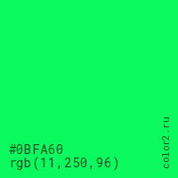 Цвет #0BFA60 в цветовой модели RGB обозначается тремя октетами (11, 250, 96) в десятичном формате и #0BFA60 в шестнадцатиричном (hex) формате, которые являются интенсивностью красного 11 (hex 0B), интенсивность зелёного 250 (hex FA) и интенсивность синего 96 (hex 60).