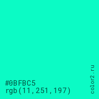 Цвет #0BFBC5 в цветовой модели RGB обозначается тремя октетами (11, 251, 197) в десятичном формате и #0BFBC5 в шестнадцатиричном (hex) формате, которые являются интенсивностью красного 11 (hex 0B), интенсивность зелёного 251 (hex FB) и интенсивность синего 197 (hex C5).