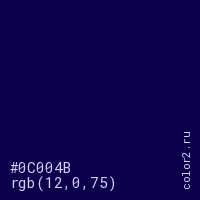 Цвет #0C004B в цветовой модели RGB обозначается тремя октетами (12, 0, 75) в десятичном формате и #0C004B в шестнадцатиричном (hex) формате, которые являются интенсивностью красного 12 (hex 0C), интенсивность зелёного 0 (hex 00) и интенсивность синего 75 (hex 4B).
