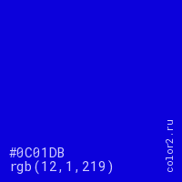 Цвет #0C01DB в цветовой модели RGB обозначается тремя октетами (12, 1, 219) в десятичном формате и #0C01DB в шестнадцатиричном (hex) формате, которые являются интенсивностью красного 12 (hex 0C), интенсивность зелёного 1 (hex 01) и интенсивность синего 219 (hex DB).