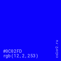 Цвет #0C02FD в цветовой модели RGB обозначается тремя октетами (12, 2, 253) в десятичном формате и #0C02FD в шестнадцатиричном (hex) формате, которые являются интенсивностью красного 12 (hex 0C), интенсивность зелёного 2 (hex 02) и интенсивность синего 253 (hex FD).