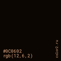 Цвет #0C0602 в цветовой модели RGB обозначается тремя октетами (12, 6, 2) в десятичном формате и #0C0602 в шестнадцатиричном (hex) формате, которые являются интенсивностью красного 12 (hex 0C), интенсивность зелёного 6 (hex 06) и интенсивность синего 2 (hex 02).