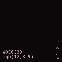 Цвет #0C0809 в цветовой модели RGB обозначается тремя октетами (12, 8, 9) в десятичном формате и #0C0809 в шестнадцатиричном (hex) формате, которые являются интенсивностью красного 12 (hex 0C), интенсивность зелёного 8 (hex 08) и интенсивность синего 9 (hex 09).