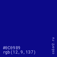 Цвет #0C0989 в цветовой модели RGB обозначается тремя октетами (12, 9, 137) в десятичном формате и #0C0989 в шестнадцатиричном (hex) формате, которые являются интенсивностью красного 12 (hex 0C), интенсивность зелёного 9 (hex 09) и интенсивность синего 137 (hex 89).