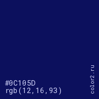 Цвет #0C105D в цветовой модели RGB обозначается тремя октетами (12, 16, 93) в десятичном формате и #0C105D в шестнадцатиричном (hex) формате, которые являются интенсивностью красного 12 (hex 0C), интенсивность зелёного 16 (hex 10) и интенсивность синего 93 (hex 5D).