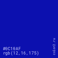 Цвет #0C10AF в цветовой модели RGB обозначается тремя октетами (12, 16, 175) в десятичном формате и #0C10AF в шестнадцатиричном (hex) формате, которые являются интенсивностью красного 12 (hex 0C), интенсивность зелёного 16 (hex 10) и интенсивность синего 175 (hex AF).