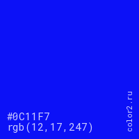 Цвет #0C11F7 в цветовой модели RGB обозначается тремя октетами (12, 17, 247) в десятичном формате и #0C11F7 в шестнадцатиричном (hex) формате, которые являются интенсивностью красного 12 (hex 0C), интенсивность зелёного 17 (hex 11) и интенсивность синего 247 (hex F7).