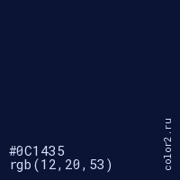 Цвет #0C1435 в цветовой модели RGB обозначается тремя октетами (12, 20, 53) в десятичном формате и #0C1435 в шестнадцатиричном (hex) формате, которые являются интенсивностью красного 12 (hex 0C), интенсивность зелёного 20 (hex 14) и интенсивность синего 53 (hex 35).