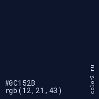 Цвет #0C152B в цветовой модели RGB обозначается тремя октетами (12, 21, 43) в десятичном формате и #0C152B в шестнадцатиричном (hex) формате, которые являются интенсивностью красного 12 (hex 0C), интенсивность зелёного 21 (hex 15) и интенсивность синего 43 (hex 2B).