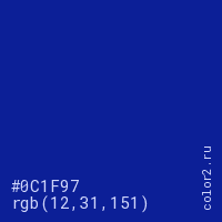 Цвет #0C1F97 в цветовой модели RGB обозначается тремя октетами (12, 31, 151) в десятичном формате и #0C1F97 в шестнадцатиричном (hex) формате, которые являются интенсивностью красного 12 (hex 0C), интенсивность зелёного 31 (hex 1F) и интенсивность синего 151 (hex 97).