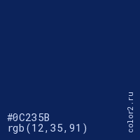 Цвет #0C235B в цветовой модели RGB обозначается тремя октетами (12, 35, 91) в десятичном формате и #0C235B в шестнадцатиричном (hex) формате, которые являются интенсивностью красного 12 (hex 0C), интенсивность зелёного 35 (hex 23) и интенсивность синего 91 (hex 5B).