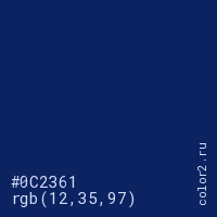 Цвет #0C2361 в цветовой модели RGB обозначается тремя октетами (12, 35, 97) в десятичном формате и #0C2361 в шестнадцатиричном (hex) формате, которые являются интенсивностью красного 12 (hex 0C), интенсивность зелёного 35 (hex 23) и интенсивность синего 97 (hex 61).