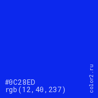 Цвет #0C28ED в цветовой модели RGB обозначается тремя октетами (12, 40, 237) в десятичном формате и #0C28ED в шестнадцатиричном (hex) формате, которые являются интенсивностью красного 12 (hex 0C), интенсивность зелёного 40 (hex 28) и интенсивность синего 237 (hex ED).