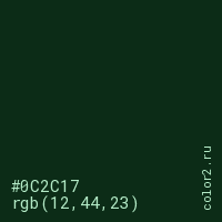 Цвет #0C2C17 в цветовой модели RGB обозначается тремя октетами (12, 44, 23) в десятичном формате и #0C2C17 в шестнадцатиричном (hex) формате, которые являются интенсивностью красного 12 (hex 0C), интенсивность зелёного 44 (hex 2C) и интенсивность синего 23 (hex 17).