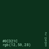 Цвет #0C321C в цветовой модели RGB обозначается тремя октетами (12, 50, 28) в десятичном формате и #0C321C в шестнадцатиричном (hex) формате, которые являются интенсивностью красного 12 (hex 0C), интенсивность зелёного 50 (hex 32) и интенсивность синего 28 (hex 1C).
