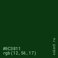 Цвет #0C3811 в цветовой модели RGB обозначается тремя октетами (12, 56, 17) в десятичном формате и #0C3811 в шестнадцатиричном (hex) формате, которые являются интенсивностью красного 12 (hex 0C), интенсивность зелёного 56 (hex 38) и интенсивность синего 17 (hex 11).