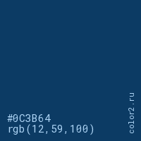 Цвет #0C3B64 в цветовой модели RGB обозначается тремя октетами (12, 59, 100) в десятичном формате и #0C3B64 в шестнадцатиричном (hex) формате, которые являются интенсивностью красного 12 (hex 0C), интенсивность зелёного 59 (hex 3B) и интенсивность синего 100 (hex 64).
