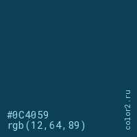 Цвет #0C4059 в цветовой модели RGB обозначается тремя октетами (12, 64, 89) в десятичном формате и #0C4059 в шестнадцатиричном (hex) формате, которые являются интенсивностью красного 12 (hex 0C), интенсивность зелёного 64 (hex 40) и интенсивность синего 89 (hex 59).