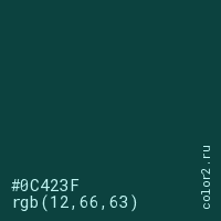 Цвет #0C423F в цветовой модели RGB обозначается тремя октетами (12, 66, 63) в десятичном формате и #0C423F в шестнадцатиричном (hex) формате, которые являются интенсивностью красного 12 (hex 0C), интенсивность зелёного 66 (hex 42) и интенсивность синего 63 (hex 3F).