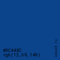 Цвет #0C448C в цветовой модели RGB обозначается тремя октетами (12, 68, 140) в десятичном формате и #0C448C в шестнадцатиричном (hex) формате, которые являются интенсивностью красного 12 (hex 0C), интенсивность зелёного 68 (hex 44) и интенсивность синего 140 (hex 8C).