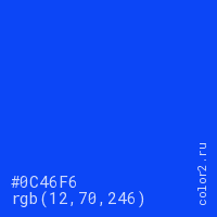 Цвет #0C46F6 в цветовой модели RGB обозначается тремя октетами (12, 70, 246) в десятичном формате и #0C46F6 в шестнадцатиричном (hex) формате, которые являются интенсивностью красного 12 (hex 0C), интенсивность зелёного 70 (hex 46) и интенсивность синего 246 (hex F6).