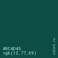 Цвет #0C4D45 в цветовой модели RGB обозначается тремя октетами (12, 77, 69) в десятичном формате и #0C4D45 в шестнадцатиричном (hex) формате, которые являются интенсивностью красного 12 (hex 0C), интенсивность зелёного 77 (hex 4D) и интенсивность синего 69 (hex 45).