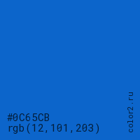 Цвет #0C65CB в цветовой модели RGB обозначается тремя октетами (12, 101, 203) в десятичном формате и #0C65CB в шестнадцатиричном (hex) формате, которые являются интенсивностью красного 12 (hex 0C), интенсивность зелёного 101 (hex 65) и интенсивность синего 203 (hex CB).