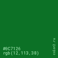 Цвет #0C7126 в цветовой модели RGB обозначается тремя октетами (12, 113, 38) в десятичном формате и #0C7126 в шестнадцатиричном (hex) формате, которые являются интенсивностью красного 12 (hex 0C), интенсивность зелёного 113 (hex 71) и интенсивность синего 38 (hex 26).