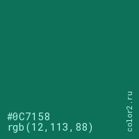 Цвет #0C7158 в цветовой модели RGB обозначается тремя октетами (12, 113, 88) в десятичном формате и #0C7158 в шестнадцатиричном (hex) формате, которые являются интенсивностью красного 12 (hex 0C), интенсивность зелёного 113 (hex 71) и интенсивность синего 88 (hex 58).