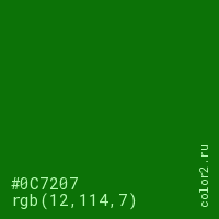 Цвет #0C7207 в цветовой модели RGB обозначается тремя октетами (12, 114, 7) в десятичном формате и #0C7207 в шестнадцатиричном (hex) формате, которые являются интенсивностью красного 12 (hex 0C), интенсивность зелёного 114 (hex 72) и интенсивность синего 7 (hex 07).