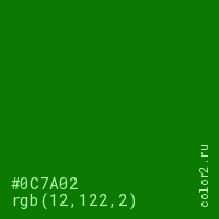 Цвет #0C7A02 в цветовой модели RGB обозначается тремя октетами (12, 122, 2) в десятичном формате и #0C7A02 в шестнадцатиричном (hex) формате, которые являются интенсивностью красного 12 (hex 0C), интенсивность зелёного 122 (hex 7A) и интенсивность синего 2 (hex 02).