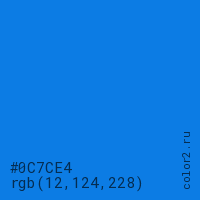 Цвет #0C7CE4 в цветовой модели RGB обозначается тремя октетами (12, 124, 228) в десятичном формате и #0C7CE4 в шестнадцатиричном (hex) формате, которые являются интенсивностью красного 12 (hex 0C), интенсивность зелёного 124 (hex 7C) и интенсивность синего 228 (hex E4).